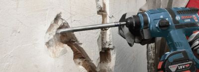 Бетонные стены представляют более сложную задачу из-за своей высокой прочности и наличия арматуры. Здесь не обойтись без мощного перфоратора с буром по бетону.